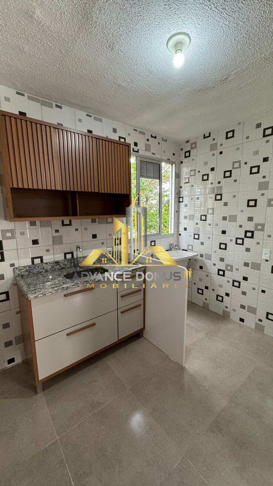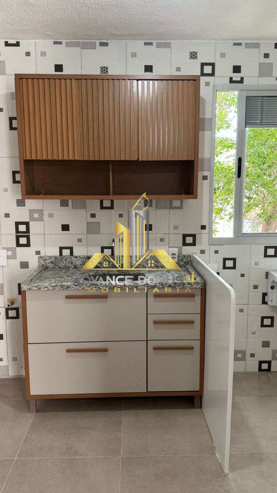 Cozinha azulejada com bancada em granito e gabinete instalado;